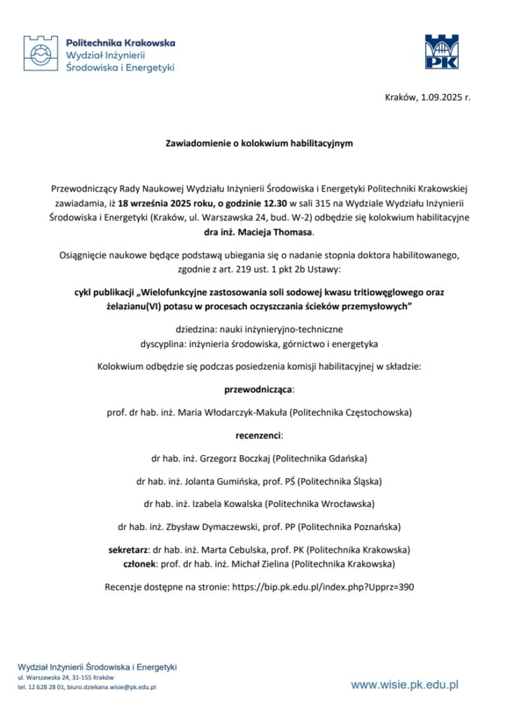 Wersja elektroniczna rozprawy, streszczenie oraz recenzje zamieszczone są na stronie internetowej BIP Politechniki Krakowskiej.
