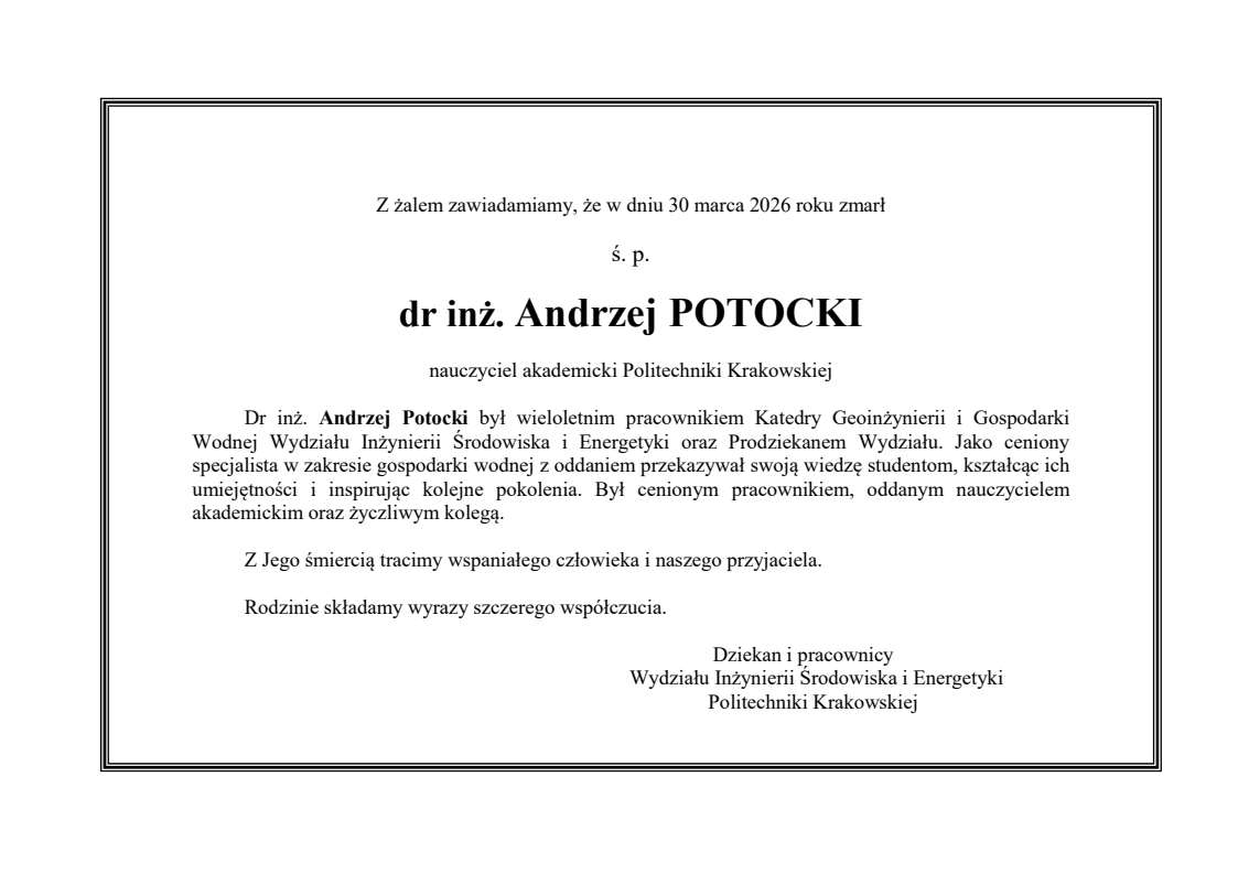 • Zmarł dr inż. Andrzej Potocki, prodziekan Wydziału Inżynierii Środowiska
