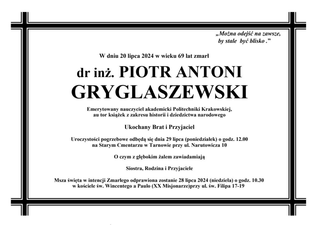Wszystkim, których śmierć Doktora Piotra Gryglaszewskiego napełniła bólem i smutkiem, a zwłaszcza Jego Najbliższym, składamy najserdeczniejsze kondolencje.